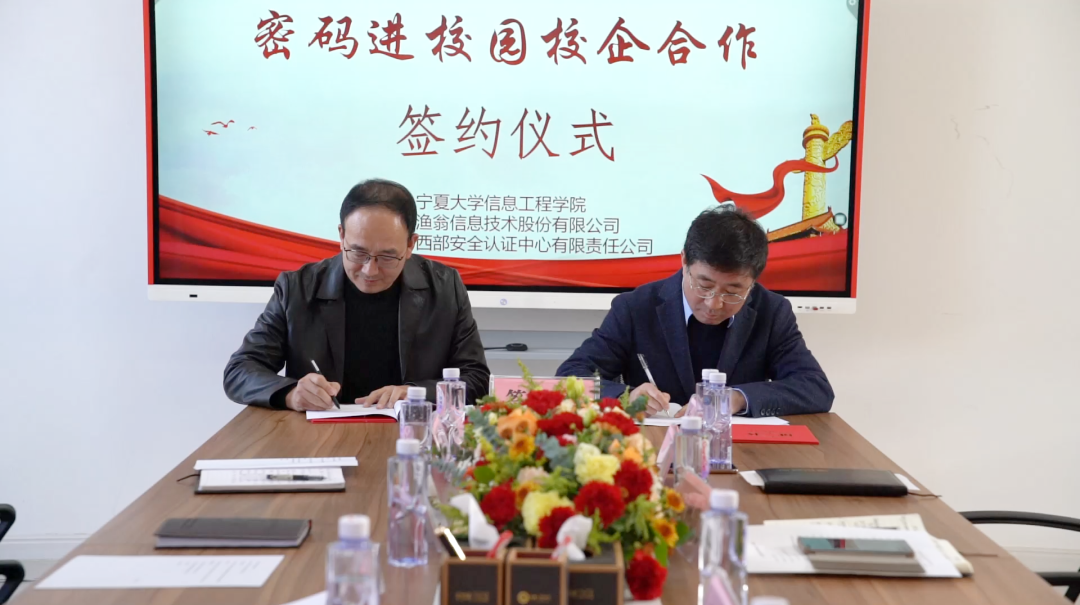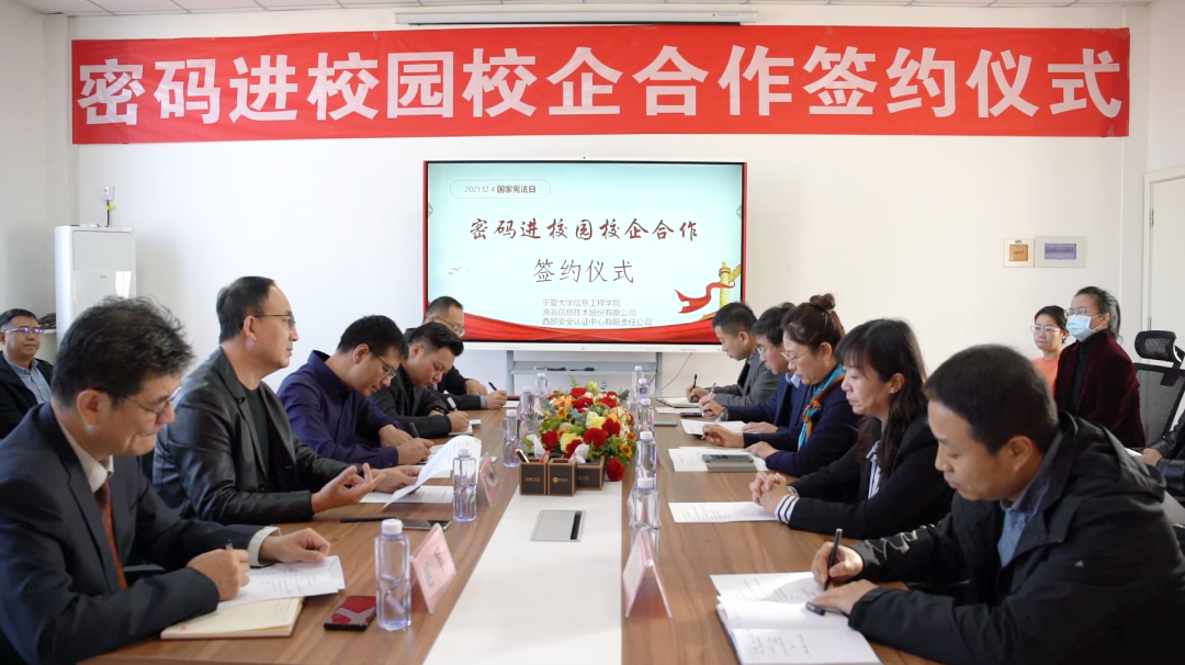在第八个国家宪法日来临之际,为深入贯彻落实《中华人民共和国密码法》,进一步加快密码专业人才队伍建设步伐,打通我区密码产学研创新链、价值链,12月1日,“密码进校园校企合作签约仪式”在宁夏大学信息工程学院成功举行。此次签约仪式由宁夏密码管理局指导,宁夏商用密码协会会员单位sbobet利记(中国)信息技术股份有限公司、西部安全认证中心有限责任公司同宁夏大学信息工程学院签署战略合作协议,共同为我区密码学科建设、密码实训基地建设、密码人才培养贡献力量。宁夏密码管理局副局长李大苞,商密处副处长丁杰,宁夏大学信息工程学院党委书记武林波、院长冯锋、副书记孙莉、副院长杨军、学科主任李贯峰,sbobet利记(中国)信息技术股份有限公司董事长郭刚,西部安全认证中心有限责任公司常务副总经理耿方,区内其他商密企业代表等出席了签约仪式,签约仪式由宁夏商用密码协会秘书长赵军主持。